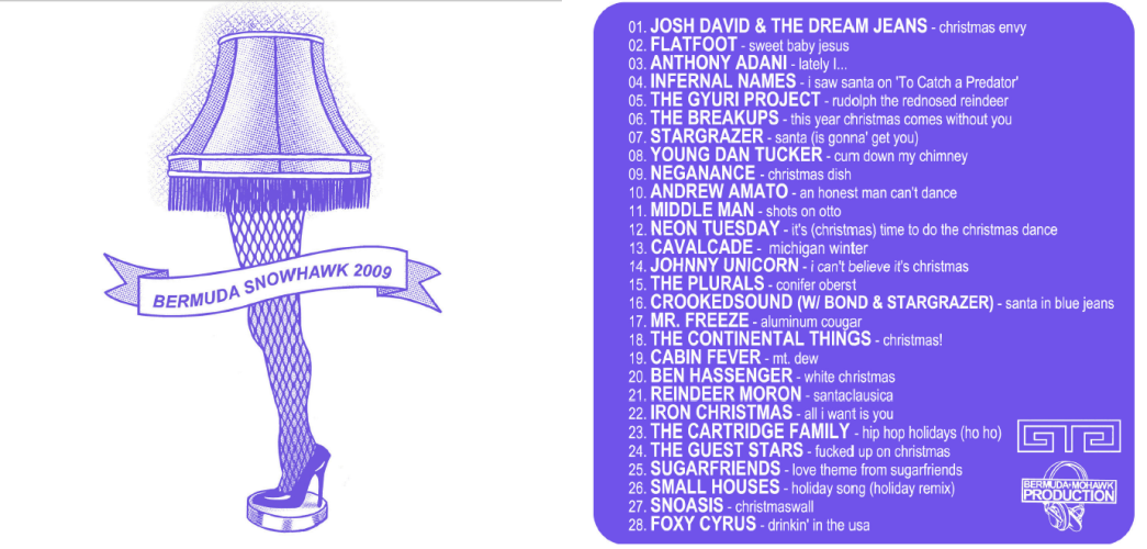 Every year around “holiday time” GTG partners up with their pals in Bermuda Mohawk Productions to release a holiday-themed album called Bermuda Snowhawk. These albums are an insane grab bag featuring everything from sincere new songs from established bands to novelty tunes from one-off side projects, with results ranging from fascinating and enjoyable to crass and unlistenable. Some of the side projects formed for these compilations have become full-time bands (Frank and Earnest), some of the songs penned by these bands have become staples of the respective band’s catalogs (Cavalcade, Frank and Earnest, Josh David and the Dream Jeans, The Plurals), and some of the bands that debut on these compilations haunt us for the rest of our lives (Young Dan Tucker). Either way, the results are always interesting, and the compilations are always free, so no one’s really getting hurt too badly. Download them here and here.