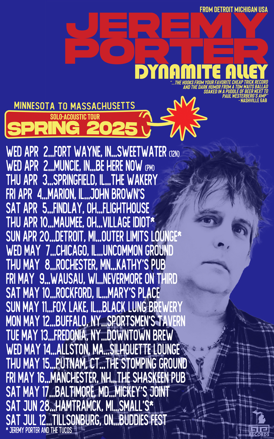 GTG Records announces the release of Dynamite Alley, the new solo album from Jeremy Porter – the Detroit-based singer/songwriter and front-man for Jeremy Porter and the Tucos. The album is his first solo release since 2019’s 1987 EP and his first full-length solo album since Party of One (Mag Wheel Records, 2010). The album, named after a 1980 episode of the motorcycle cop-dramedy “CHiPs” (s03e23), with a nod to Rod Stewart’s second solo album Gasoline Alley, includes ten songs ranging from sparse acoustic numbers to cowpunk-rocking classics and country-rock tear-jerkers.